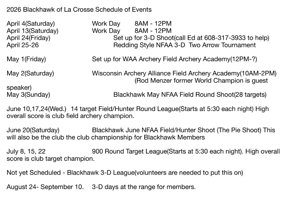 Blackhawk Archers of La Crosse Wisconsin, Inc embraces and promotes the sport of archery in all its forms; whether in competition or field and without bias toward the type of archery equipment used. While i pursuit of this goal we hold essential values of fellowship, family, and sportsmanship of all. We will conduct our business in a fair and ethical manner and will co-operate with any government, civic and/or archery associations with which the club may become affiliated.